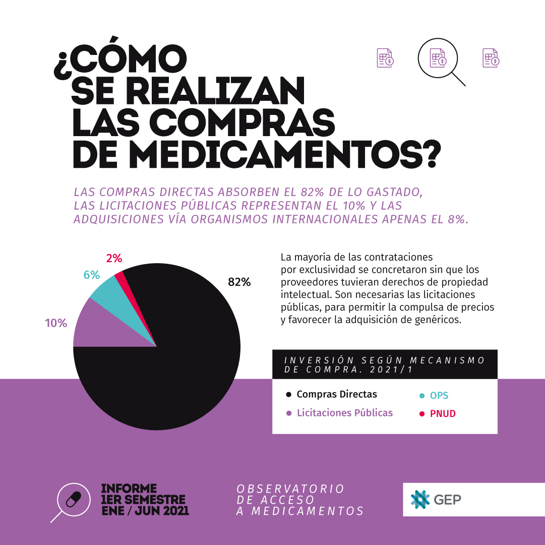 Del análisis se desprende que las compras directas absorbieron el 82% de los recursos invertidos, mientras que las licitaciones públicas representaron solo el 10% de las compras y las adquisiciones vía organismos internacionales, apenas el 8%. Además, la mayoría de las contrataciones por exclusividad se concretaron sin que los proveedores tuvieran derechos de propiedad intelectual (es decir que podrían haber sido adquiridas en versiones genéricas, a precios más competitivos). Por eso, decimos que son necesarias las licitaciones públicas, para permitir la compulsa de precios y favorecer la adquisición de genéricos.